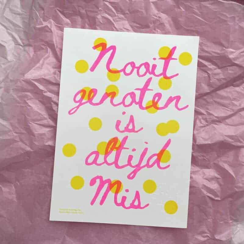 De kleuren! Bij zeefdruk en Riso print kun je gebruik maken van lekker felle kleuren die van het papier afknallen. Ook kun je allerlei soorten papier en materialen bedrukken met zeefdruk om zo unieke producten te maken.